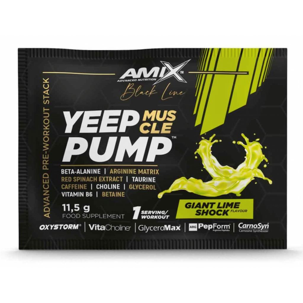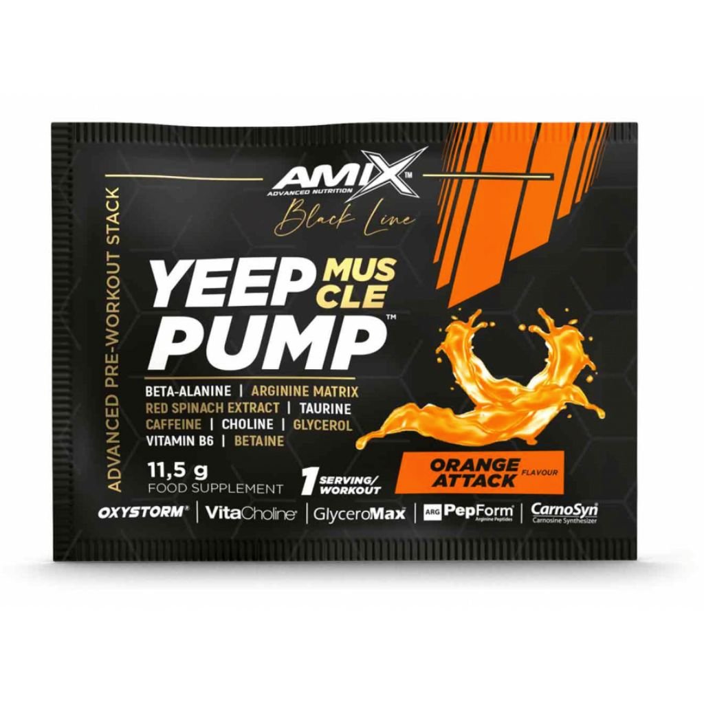 Amix™ Yeep Pump je revoluční super koncentrovaný předtréninkový doplněk určený pro nejnáročnější sportovce, aby posunuli své intenzivní tréninky na další úroveň. Tento osvěžující a chutný nápoj je založen na dávce 3 g CarnoSyn® beta-alaninu s obsahem argininového komplexu,Taurinu, L-Lysinu, glycerinu GlyceroMax™, VitaCholine®, extraktu z červeného špenátu Oxystorm® a Betainu. Vitamin B6 pomáhá snižovat únavu a vyčerpání, zatímco kofein přispívá ke zvýšení odolnosti, pomáhá zlepšit koncentraci a bdělost.