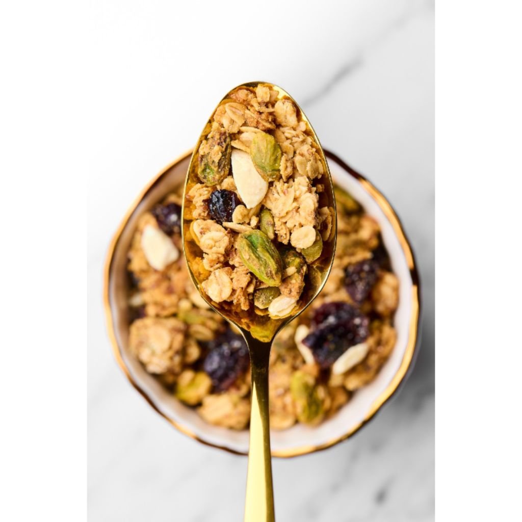 Křupavé kousky granoly z bezlepkových BIO ovesných vloček, ke kterým jsme přidali BIO pistácie. Ty jsou zdrojem kvalitních tuků s vysokým podílem nenasycených mastných kyselin a vitamínů skupiny B. Pro sladší a jemnější chuť jsme granolu doplnili o kousky bílé čokolády a námi vyrobený mandlový krém z BIO mandlí. Jako tuk zde posloužilo BIO ghí, které má příjemnou máslovou vůni s lehkým oříškovým aroma. Kromě toho obsahuje zdraví prospěšné omega 3 a 6 mastné kyseliny doplněné o látky udržující zásadité prostředí v těle. Obsahuje kyselinu máselnou, která je důležitá pro naši střevní sliznici.