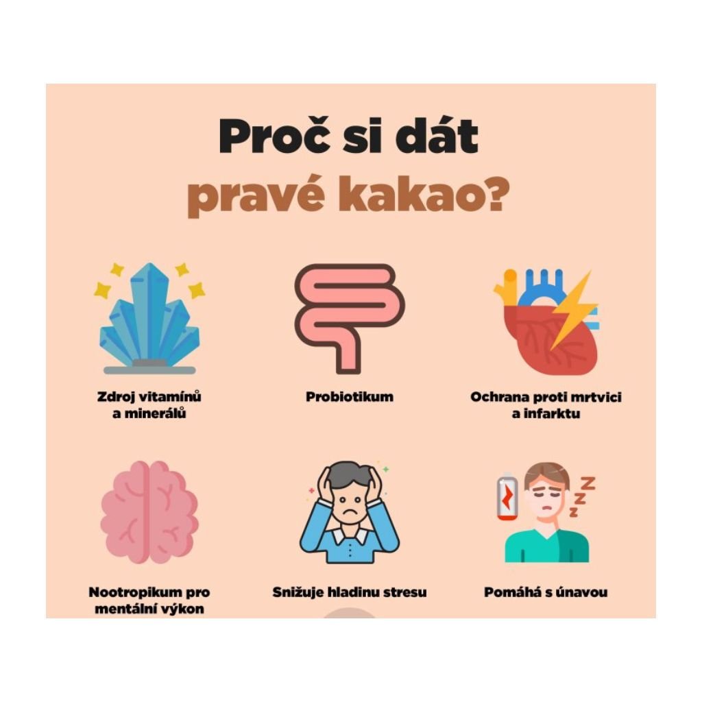 Drcené nepražené kakaové boby jsou bohatým zdrojem polyfenolů, theobrominu a minerálů. Tyto látky mohou mít řadu pozitivních funkcí v lidském těle. Kromě toho kakao obsahuje aminokyselinu tryptofan, kterou tělo používá k výrobě serotoninu a díky tomu může pozitivně působit na psychiku a podporu energie. Kakao je také zdrojem železa, který je na rozdíl od některých rostlinných zdrojů minerálu snadno vstřebatelný. Proto je kakao oblíbený zdroj železa u veganů.