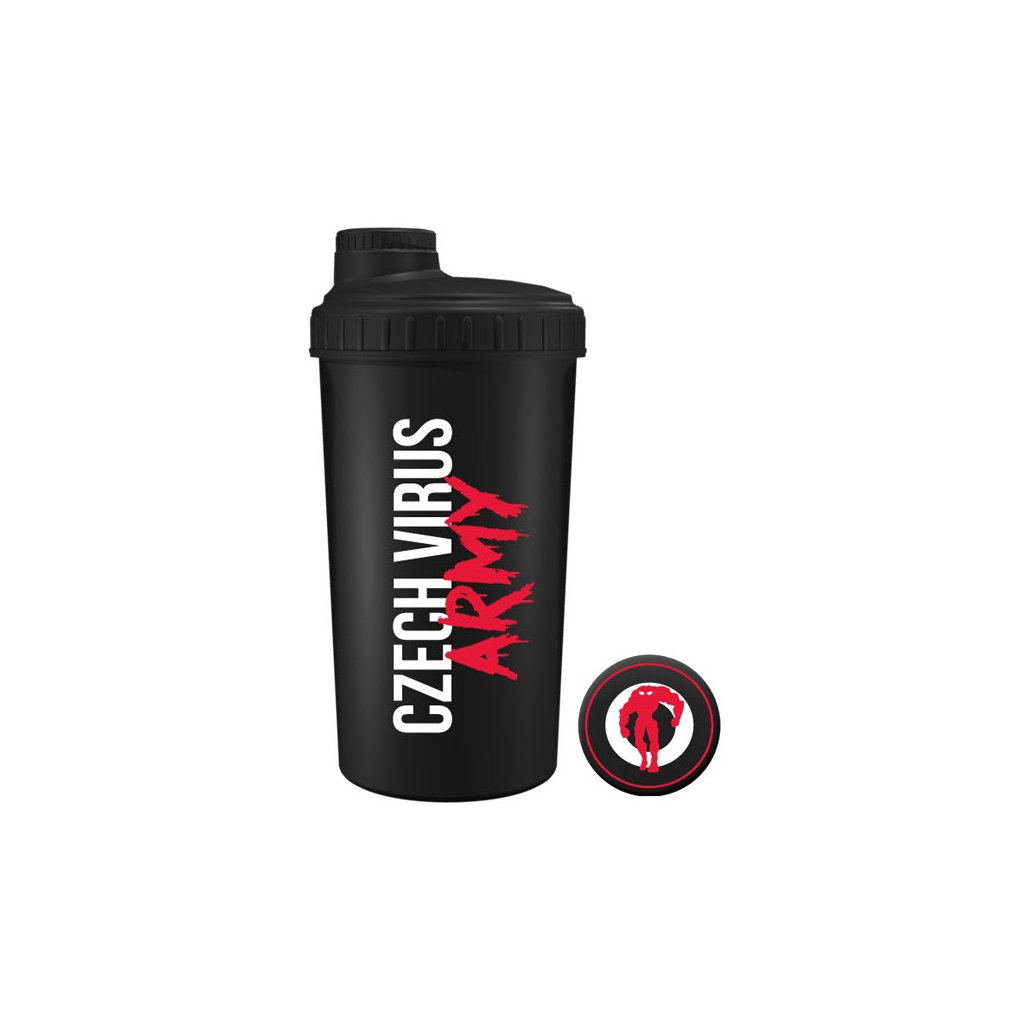 Klasický shaker se šroubovatelným uzávěrem, který zajistí tekutinu před protečením. Krásný design a skvělé rozmíchané suplementy. Kompletně rozebíratelný pro výborné vyčištění. Na obou stranách potisk "Czech Virus Army". Měřící stupnice uvedena na straně shakeru.