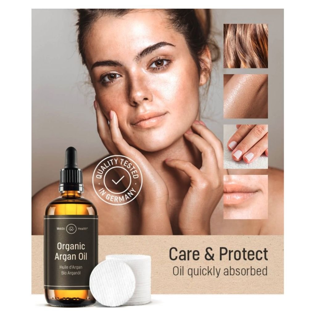 Woldohealth 100% Bio arganový olej s vysokým obsahem vitamínů A, E, F, antioxidačních látek a esenciálních mastných kyselin. Arganový olej má na pleť unikátní a blahodárný efekt, hydratuje a regeneruje pokožku, zmírňuje výskyt vrásek a dodává pleti pružnost a elasticitu. Působí preventivně proti zánětům a dermatologickým onemocněním. Má také blahodárný vliv na vlasy a řasy.